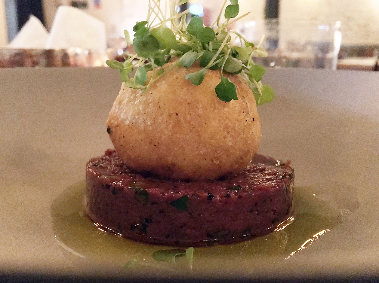 The warmly-lit dining room is tastefully decorated with an occasional strip of Iznik-style tiles running across the walls. Which are not pictured in this photo of a cig kofte tartare.