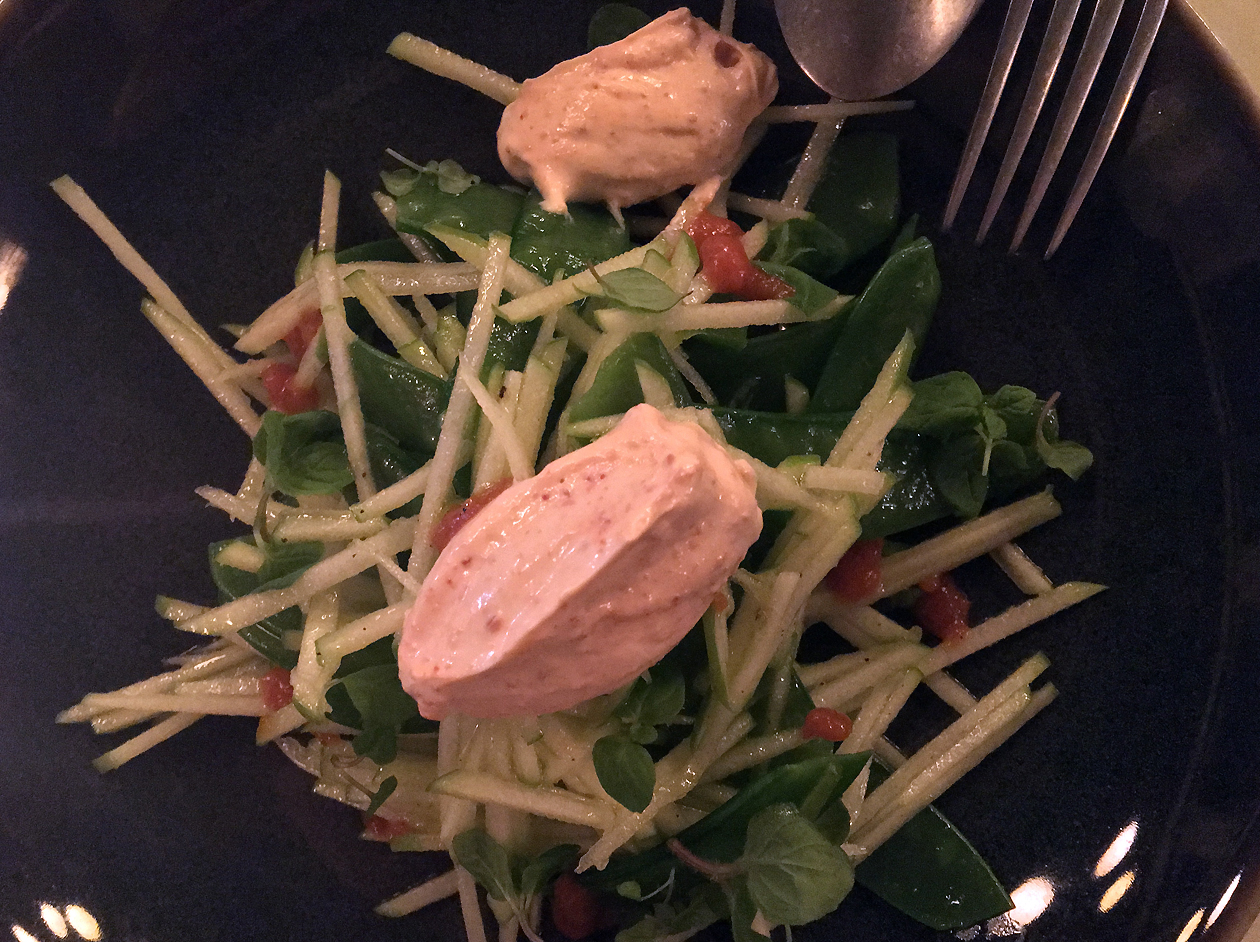 Mangetout and julienned apple were perfect partners-in-crime, the sweet crispness of each almost indistinguishable from the other. They were perfect conveyors for a potent sriracha-esque chilli heat which was itself neatly offset by by a smooth milky yoghurt.