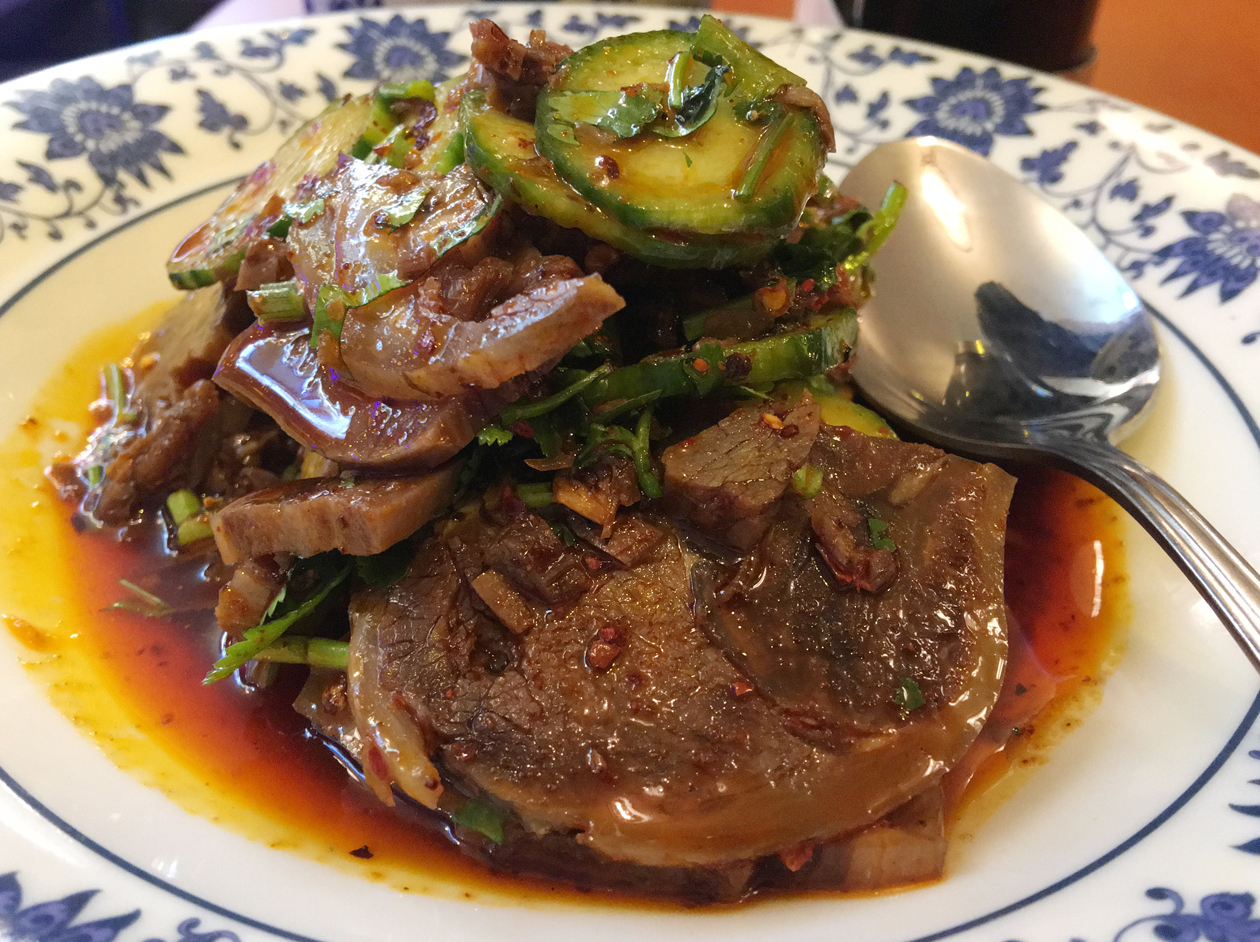 Pig’s tripe had been julienned and served in chilli oil. As well as packing a cumulatively fiery heat, the sauce clung to the firm, bouncy offal slivers better than I had expected.