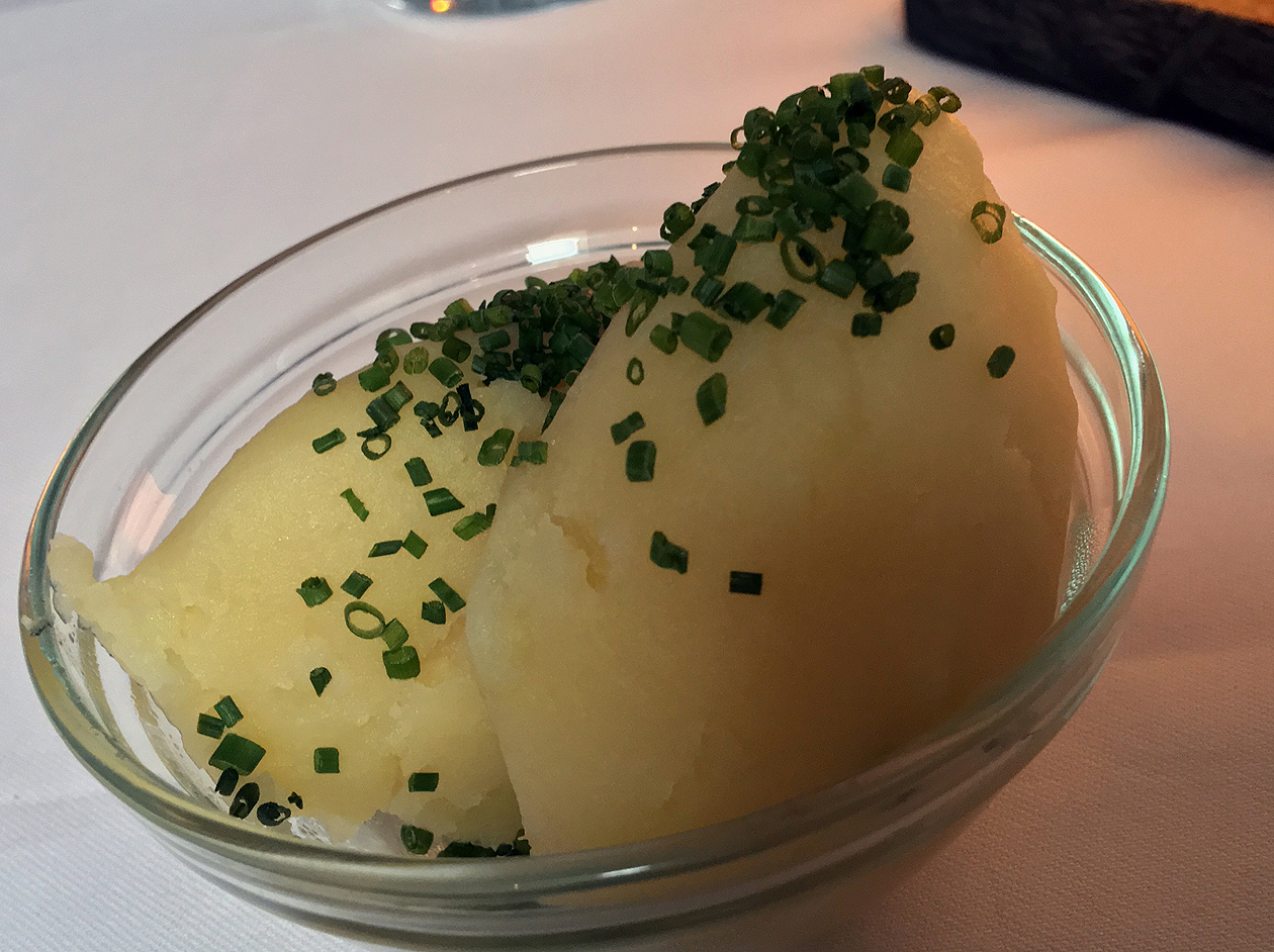 Crushed potatoes were effectively a chunky mash dotted with bittersweet herby hints. An effective side dish.