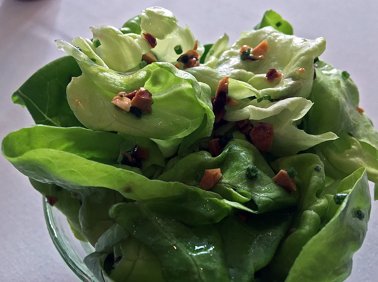 A simple green salad punched well above its weight thanks to a sprightly dressing and a dusting of punchy hazelnuts.