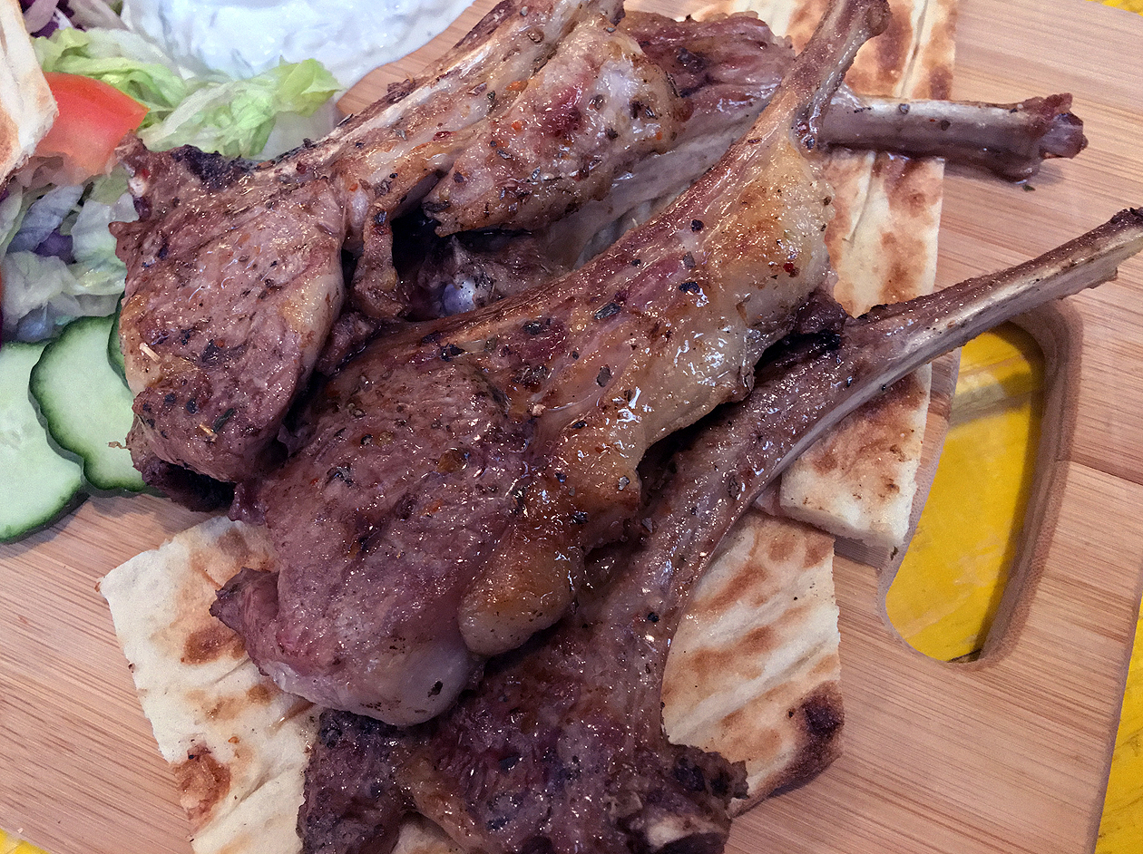 Cubes of lamb shish were often too tough to cut and chew, an annoyance which dissipated the goodwill that had been generated by the shish’s offaly moistness. Lamb chops proved to be far better, not only in tenderness but in character too thanks to strips of neatly rendered fat and a heavy dusting of thyme and seasoning.