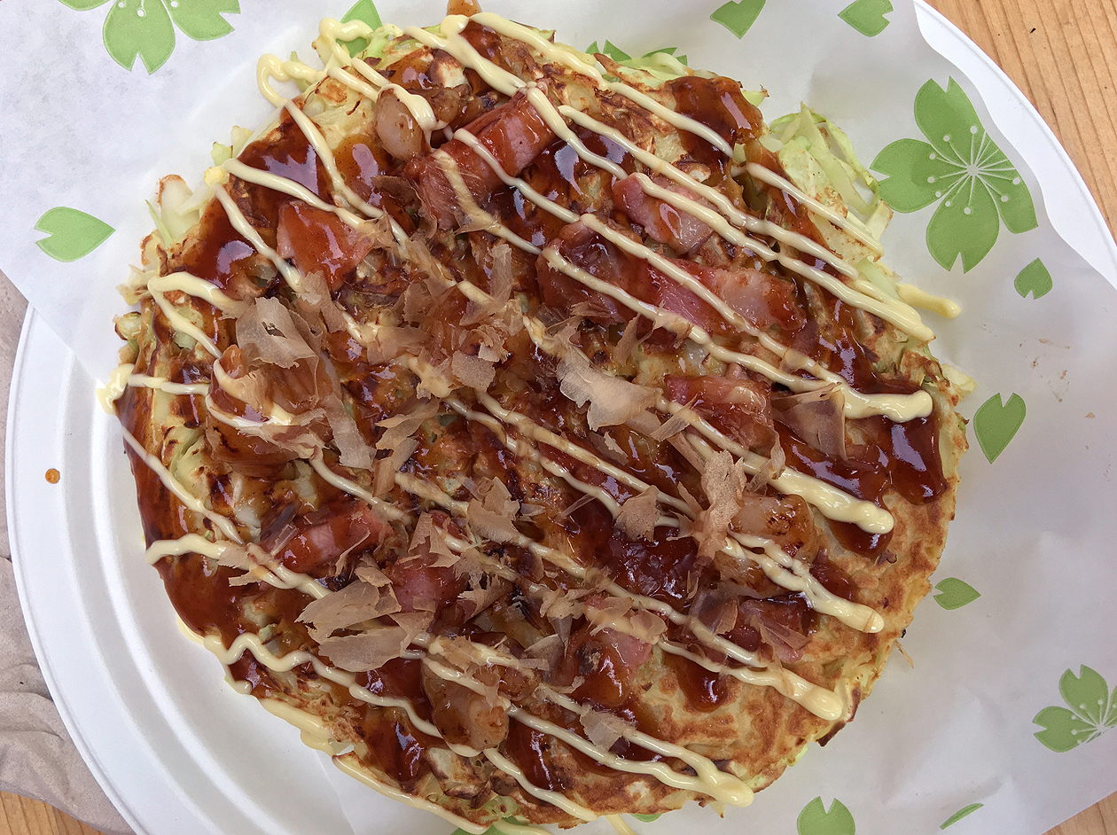 Surprisingly, the plain okonomiyaki topped with nothing more than spicy sauce was a somewhat more enjoyable affair. The fluffy soft and gently chewy batter was far easier to appreciate, shorn of the subpar protein. Mildly tart and sweet brown sauce and the lightly piquant sriracha-style spicy sauce were far better partners for the batter than second-rate bacon and shrimp. The unwantedly buxom layer of cabbage was, of course, still present though.