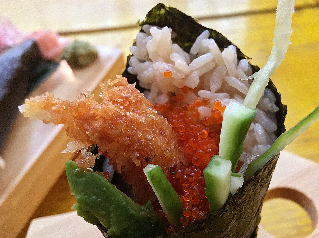 The least offensive of all the dishes I tried was, unsurprisingly, the prawn katsu temaki roll – a dish most suited to street food life. The nori wrapper was a tad too chewy, but that might just be me. The soft medium-grained rice, creamy avocado and crunchy, malty golden brown panko made up for the weeny shrimp and shrug-inducing tobiko.