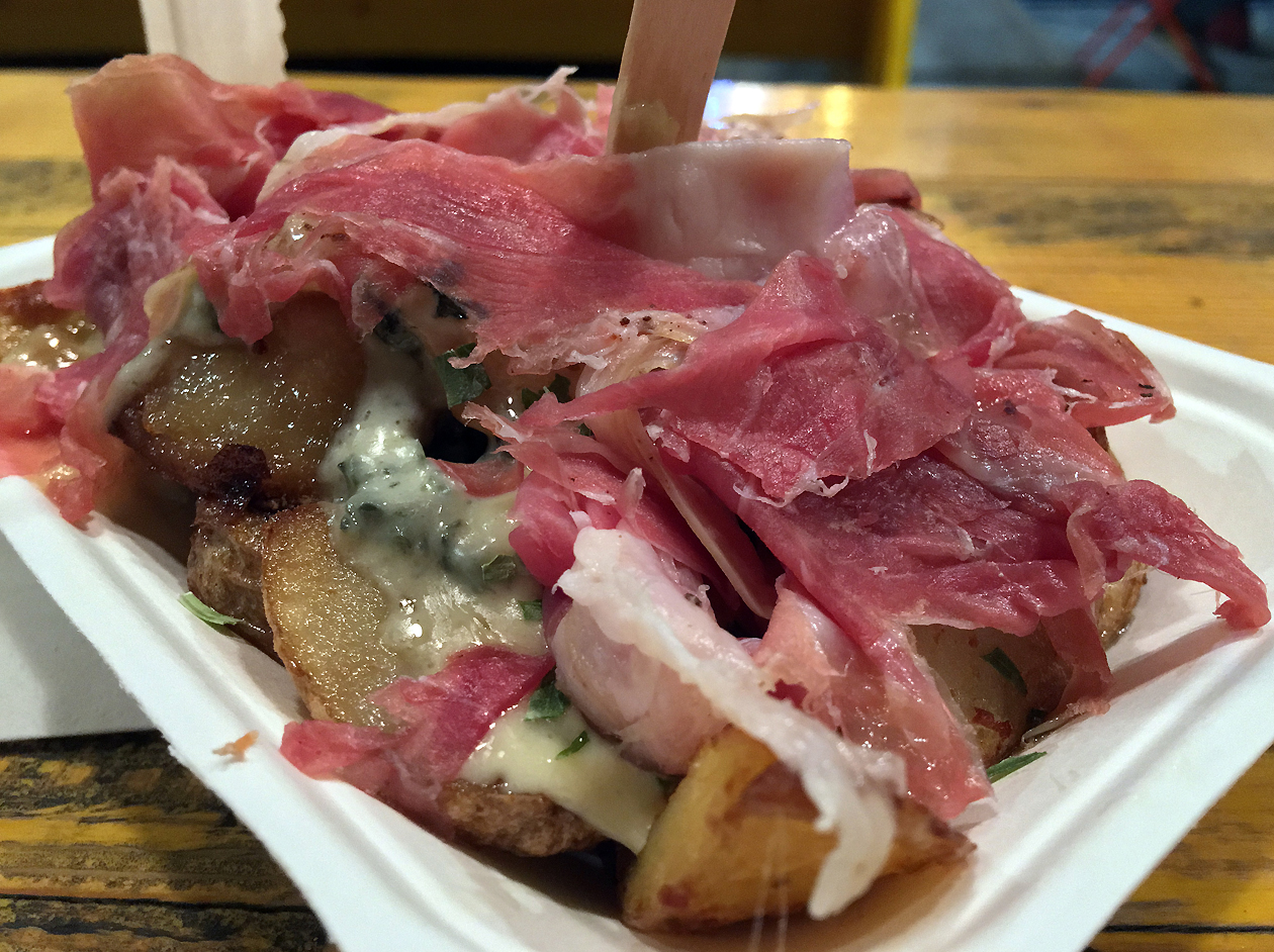 Wedges topped with raclette, ham and fourme d’ambert from Champangne Fromage at Mercato Metropolitano.