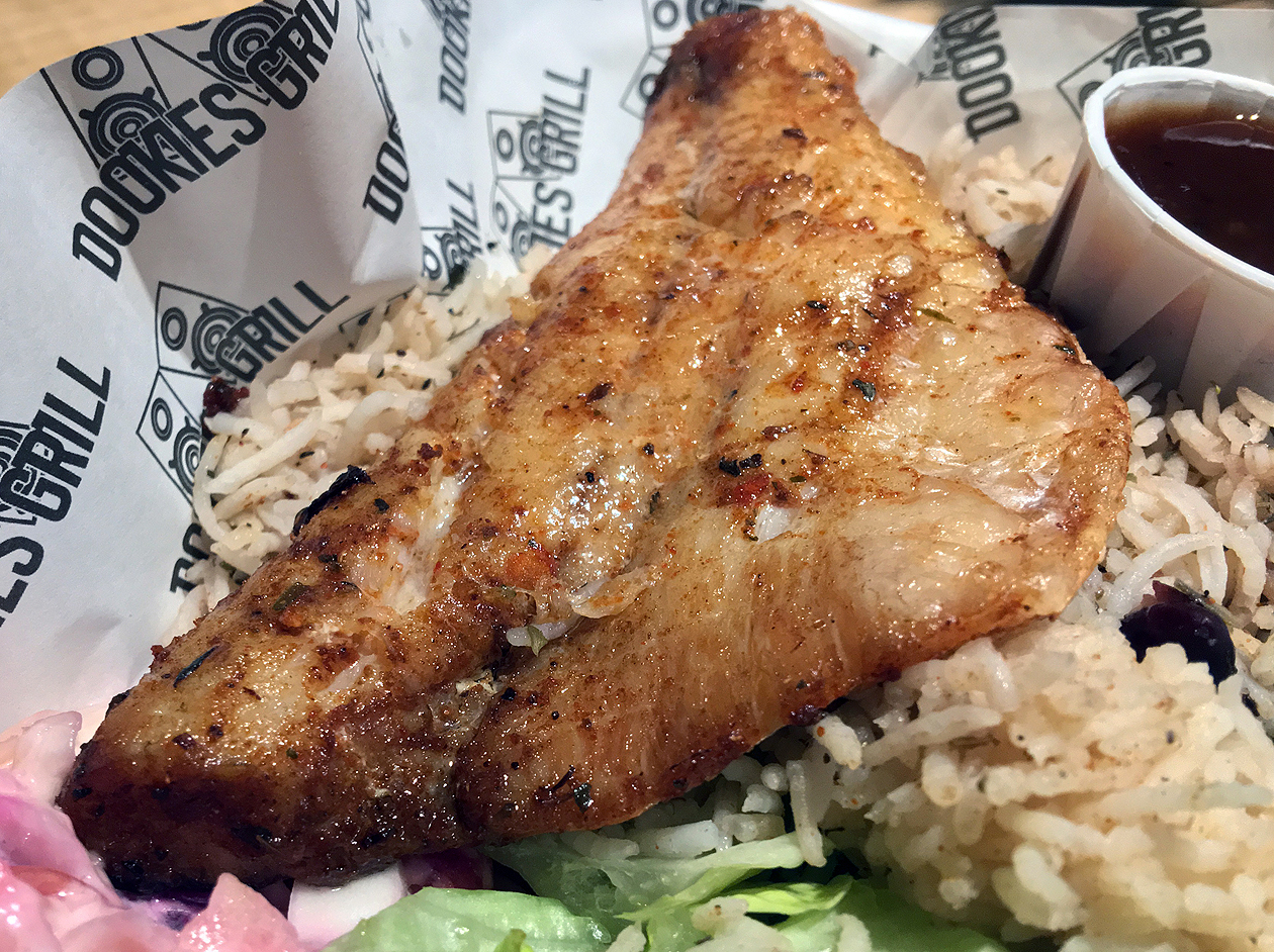 It strikes me that there should be an apostrophe in ‘Dookies’. Whether or not that should be the case, there should definitely be more innate flavour in Dookies’ jerk chicken. While the meat was good enough on its own terms with the slippery skin sliding off the moist, gamey chicken, there was very little rub, dry or wet. Most of the flavour came from a sauce squirted onto the cooked chicken after the fact. Its tingly fruity heat was enjoyable enough, but this felt less like jerk chicken and more like a mildly gussied up Parisian rotisserie chicken.