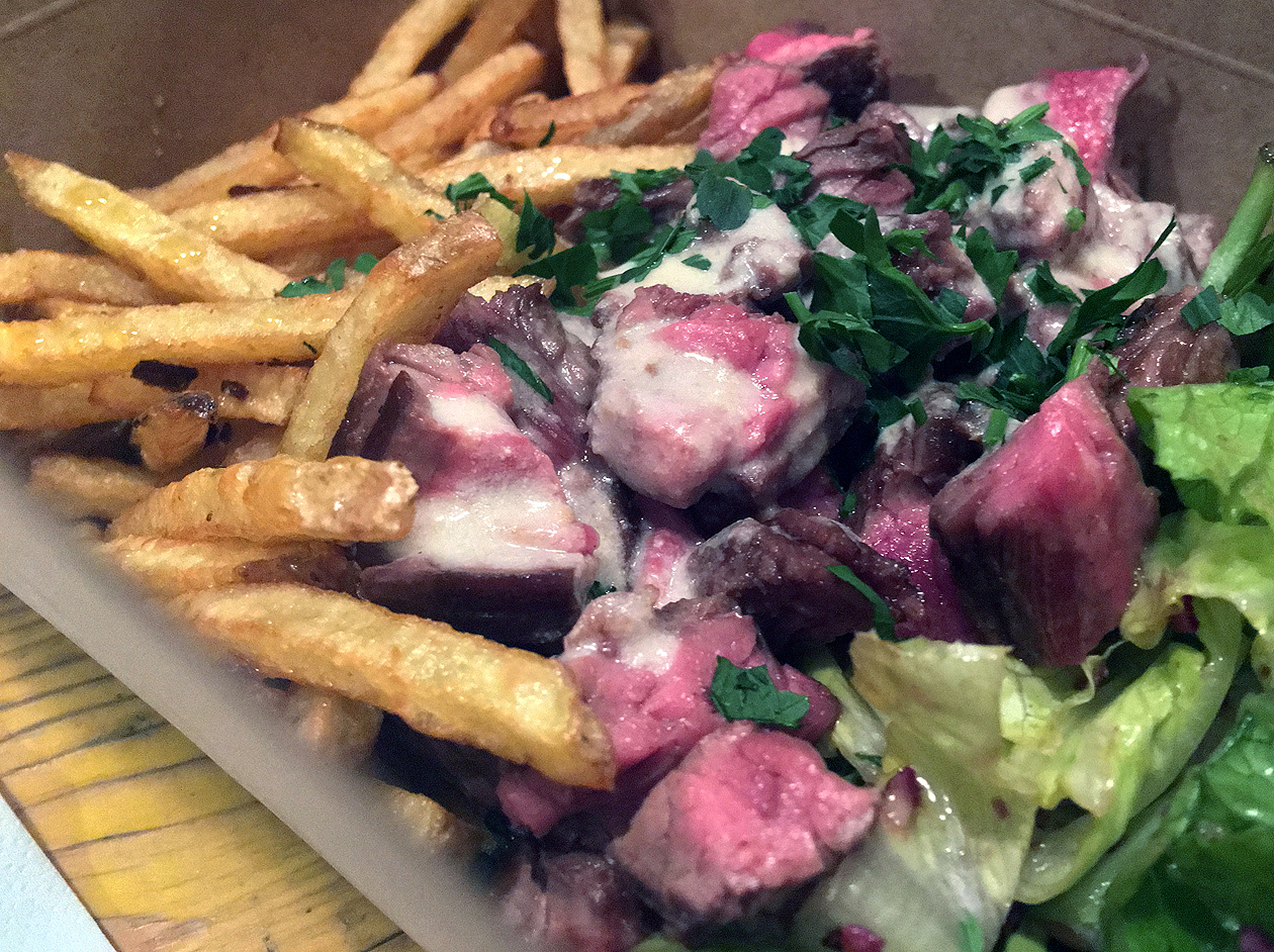 Le Beefed’s charmingly Franglais name appears to be based solely on the addition of lightly tangy blue cheese to its steak. Even when taken without the cheese’s lactic accenting, the beef was already good enough in its own right – dense yet tender with a moreishly beefy tang and a respectable level of browning. Even when taking the weedy fries into consideration, Le Beefed is still considerably better than Butcher and Grill. In a kinder world, Le Beefed wouldn’t just be a temporary outside kiosk but the main indoor steak purveyor in place of Butcher and Grill.