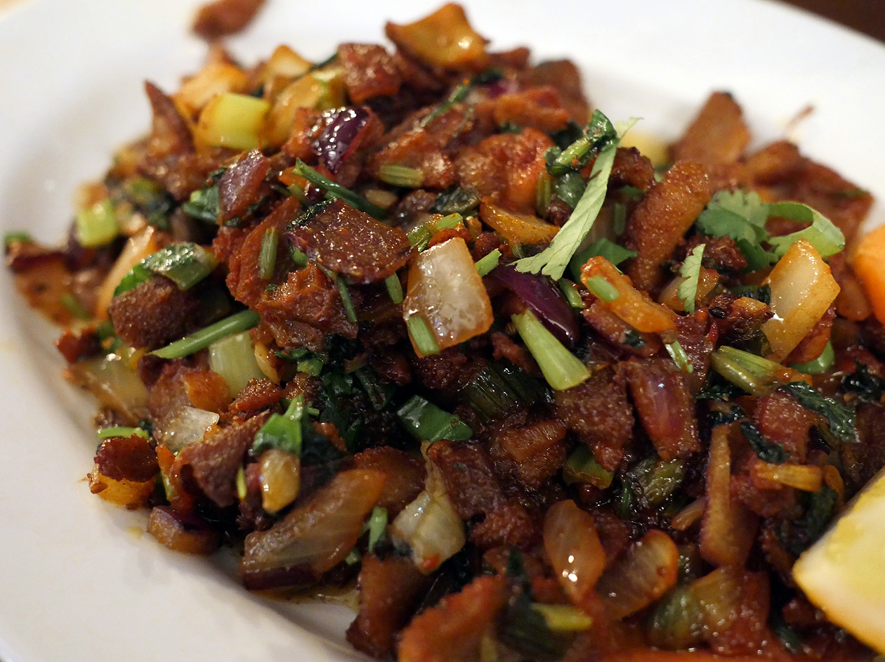 A plate of bhutan may have been crispy, but these strips of tripe were still identifiable as such with their dimpled, ribbed surface belying a residual softness. The superlative texture of this tripe made them the perfect conveyor for the umami pepperiness of the seasoning.