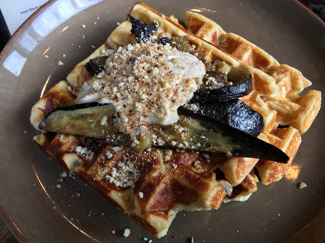 If that sounds a bit much, then there is a lighter alternative where the waffle comes topped with aubergine instead. Although the aubergine wasn’t cut as thickly as I would’ve preferred, some of the eggplant’s fleshiness and distinctive flavour still managed to shine through. The latter was neatly complimented by the nutty, creamy umami of a cashew-miso cream which was itself augmented by an aromatic dusting of finely ground peanuts. Although not perfect, this was nonetheless a satisfying dish and an emblematically vegetarian one too – it not only didn’t need meat, it wouldn’t have been improved by the presence of it.
