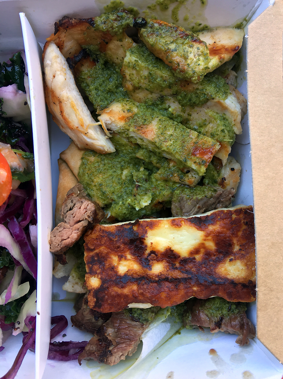 Of the three protein toppings on offer, cow’s milk halloumi was consistently the most crowd pleasing with its squeaky saltiness. If the bovine gods are kind, then you’ll be blessed with relatively tender and well-browned steak. If not, then you’ll end up with chewy shoe leather. Moist but bland chicken was pepped up by a vaguely moreish herb sauce. One of the advantages to having all three is that their juices soak through to sheafs of pitta sitting underneath, with the soaked carbs often proving to be far more enjoyable than the meat and cheese.