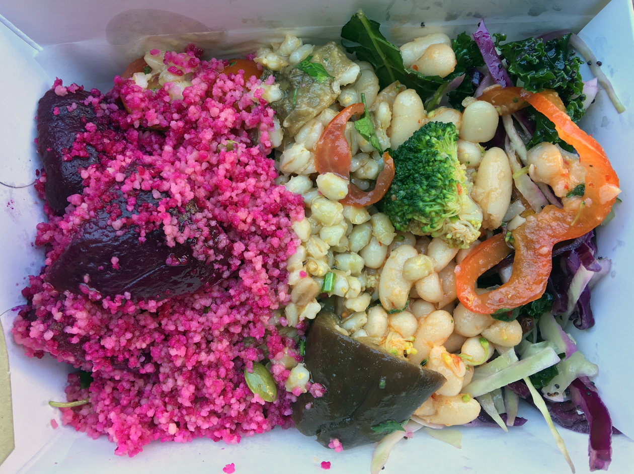The choice of salads can vary, but a workman-like pairing of beetroot and cous cous makes frequent appearances. The bittersweet mix of lightly dressed kale and cabbage is an even better choice, as is a heap of croutons soaked through with the juices of umami tomatoes. Buttery borlotti beans were let down by tired, overcooked peppers, aubergine and broccoli.