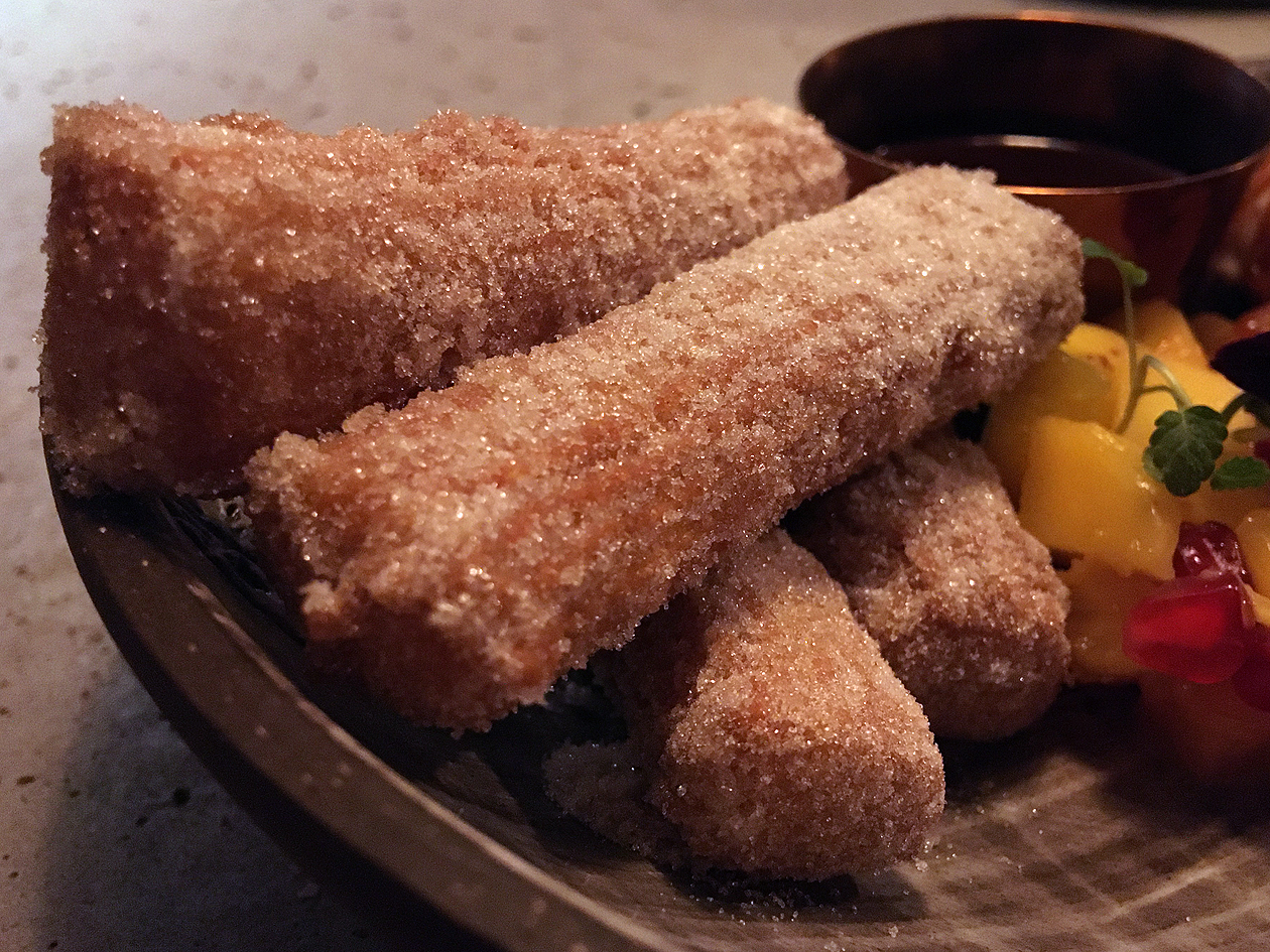 Although the churros were initially crisp, they quickly disappointed with hollow interiors and a wan, timid dulche de leche. At least the ice cream was smooth and milkily refreshing, but that hardly made up for the incomplete mouthfeel of the churros.