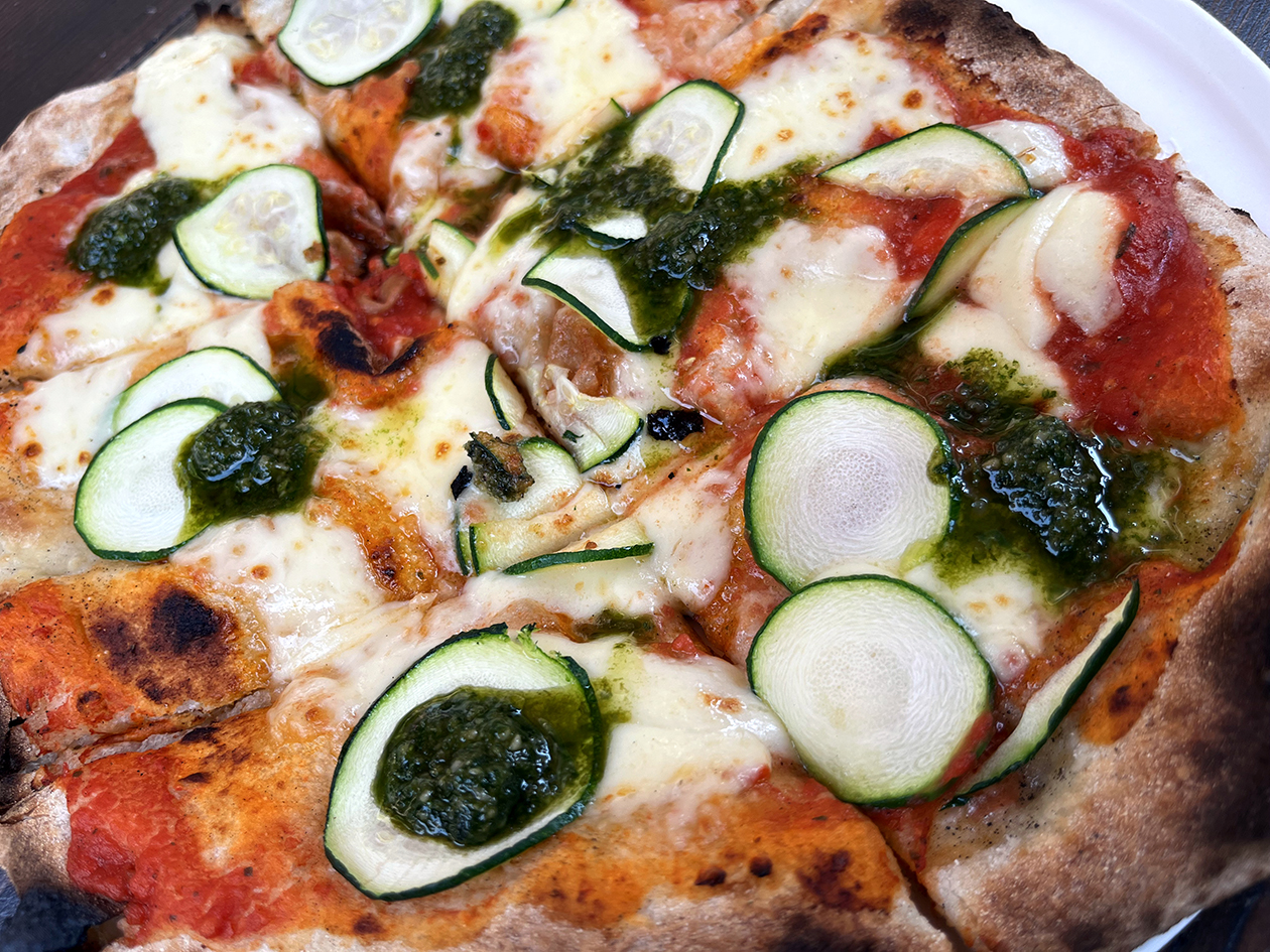 The carby components of the Veggie were similar to those of the Big Smoke, but more evenly airy and crunchy crisp. Although noticeably improved, it was still arguably a little too hard in places. This relatively modest flaw didn’t dull my enjoyment of hefty, gooey mozzarella or the gently sweet and milky courgette. The tomato and wee dollops of pesto were only occasionally umami though, which made this otherwise enjoyable pizza somewhat out-of-kilter.