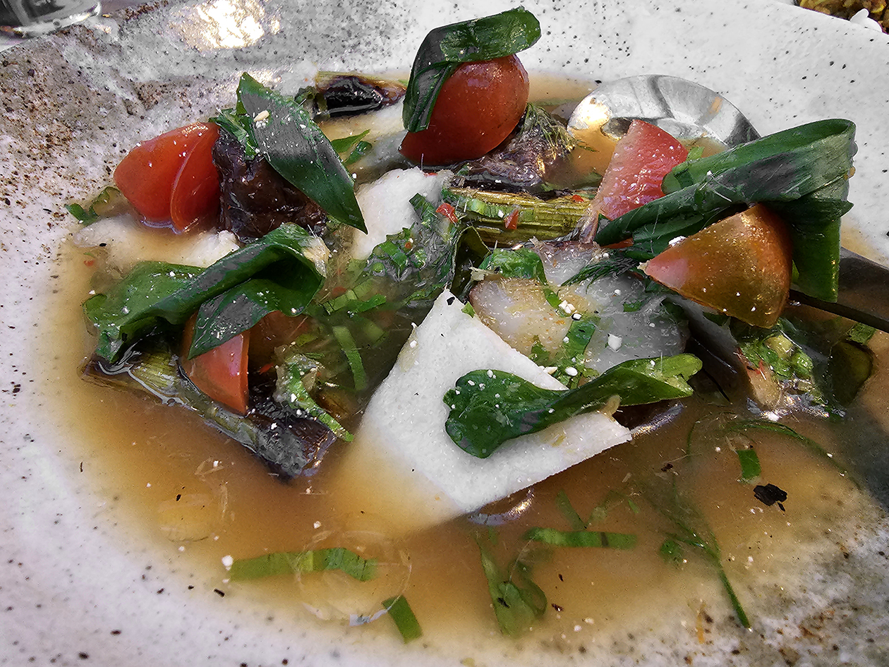 A trio of vegetables – Jerusalem artichoke, palm heart ad leeks – wasn’t love at first bite, but its charms slowly grew on me. The smoky fleshiness of the artichoke and the slight chewiness of the leeks was made even better by the light muskiness and umami of the thin broth, as well as by a dash of distinctive dill.
