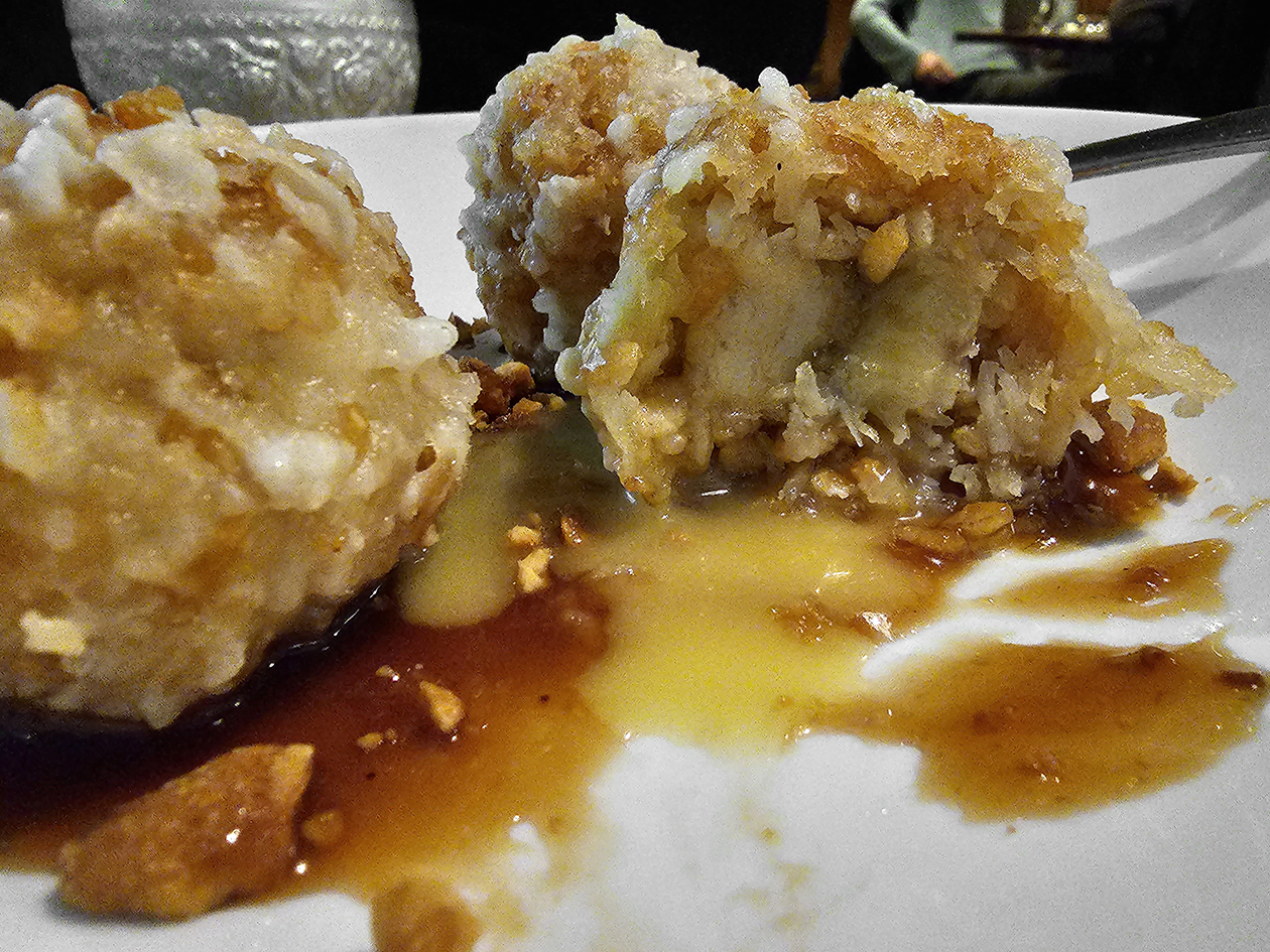 Banana fritters benefited from crunchy, moderately thick batter, the curlices of which were free from excess oil. But the un-aged fruit lacked caramelisation, as did the tamarind caramel on the side. The turmeric custard was thin in both taste and texture. I really wanted to love this dessert given the quality of the deep-fried batter, but in the end the affection only went skin deep.