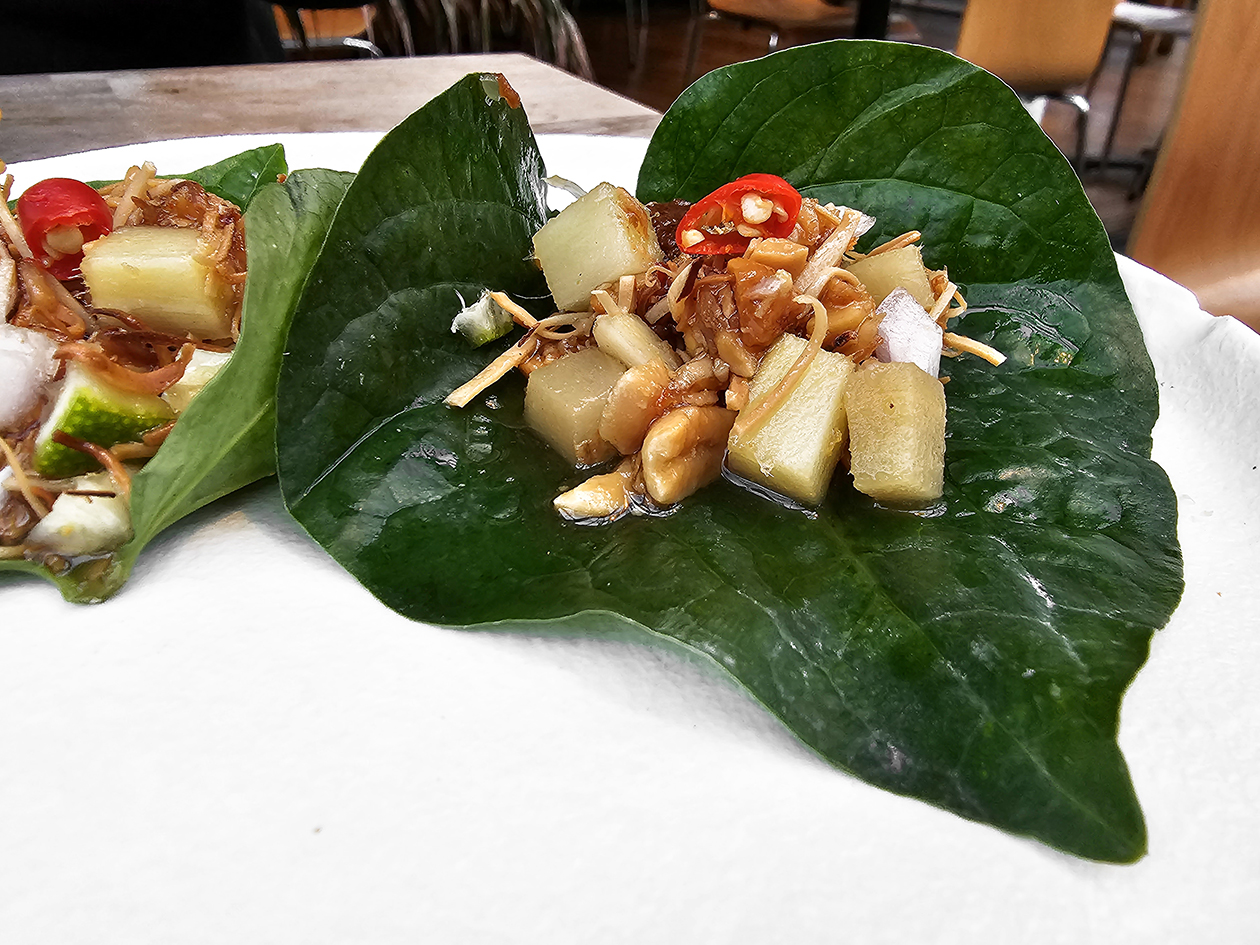 Miangs of ginger, peanut, shallot, coconut, galangal and palm sugar, mixed up and served on betel leaf, may have been small in size. But they packed a powerful presence – sweet, fiery, tangy and nutty, all in a single mouthful.