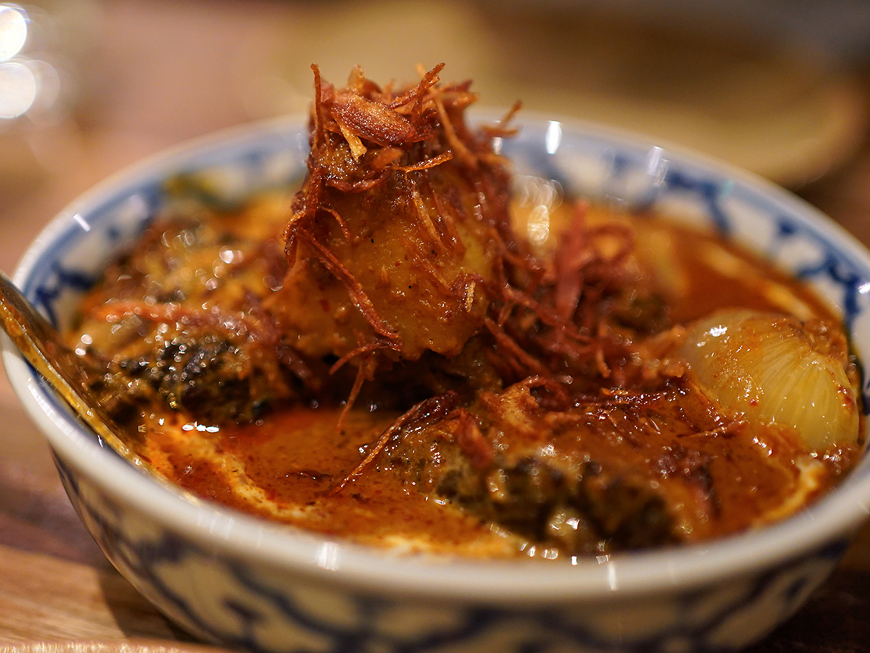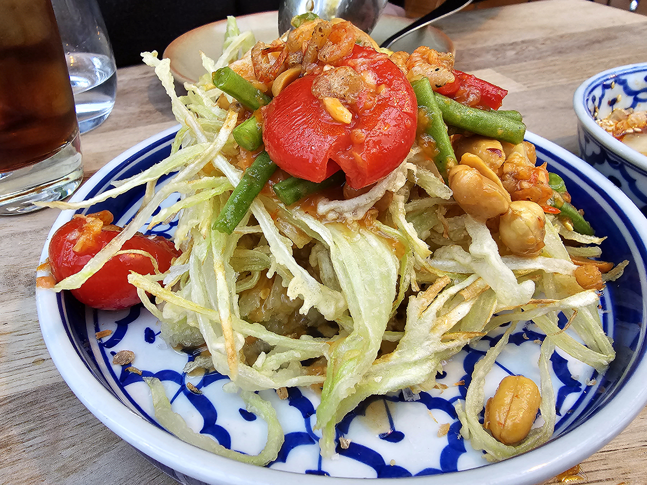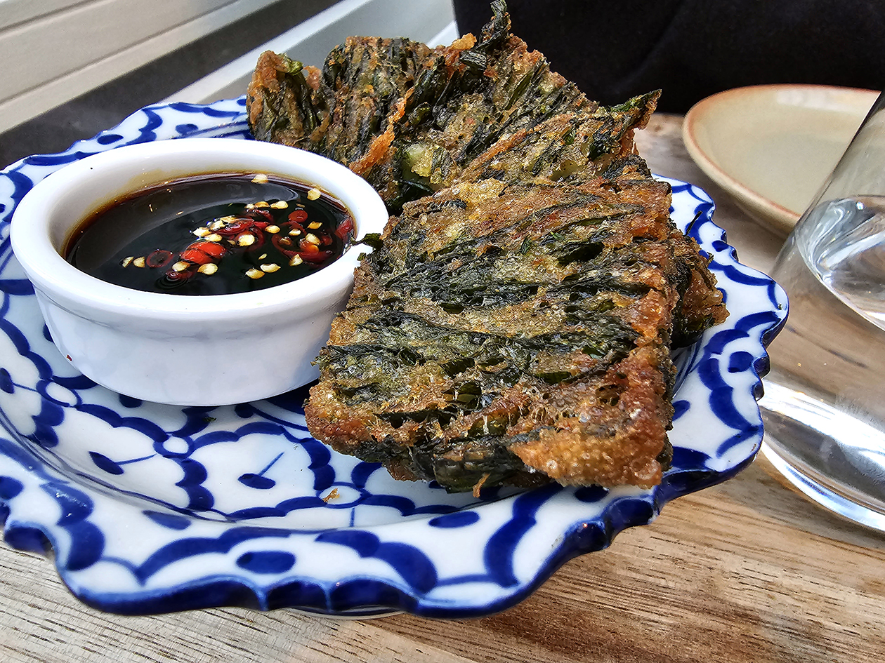 Som tam fritters sound subversively Caledonian, but this was an almost Japanese-like display of artistic deep frying. The light dusting of batter was gently crisp, segueing almost seamlessly into the velvety reeds of green papaya underneath. The nutty crunch and mild chilli kick of the peanuts and long beans respectively could’ve been stronger, but the heat was helped along modestly so by by a nam pla prik-style garnish sauce.