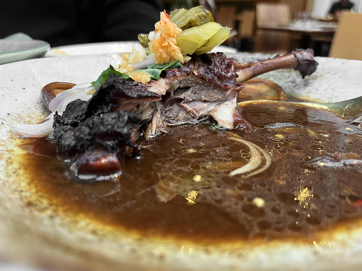 I’m not sure what was more misconceived about the duck leg dish – choosing lean duck leg over fatty duck breast, or grazing it with an apologetically meek ‘Five Spice’ rub. There was some joy to be had here, from the tender meat to the mild umami of the thin broth, the latter helped along somewhat by shiitake. But it was all far too fleeting.