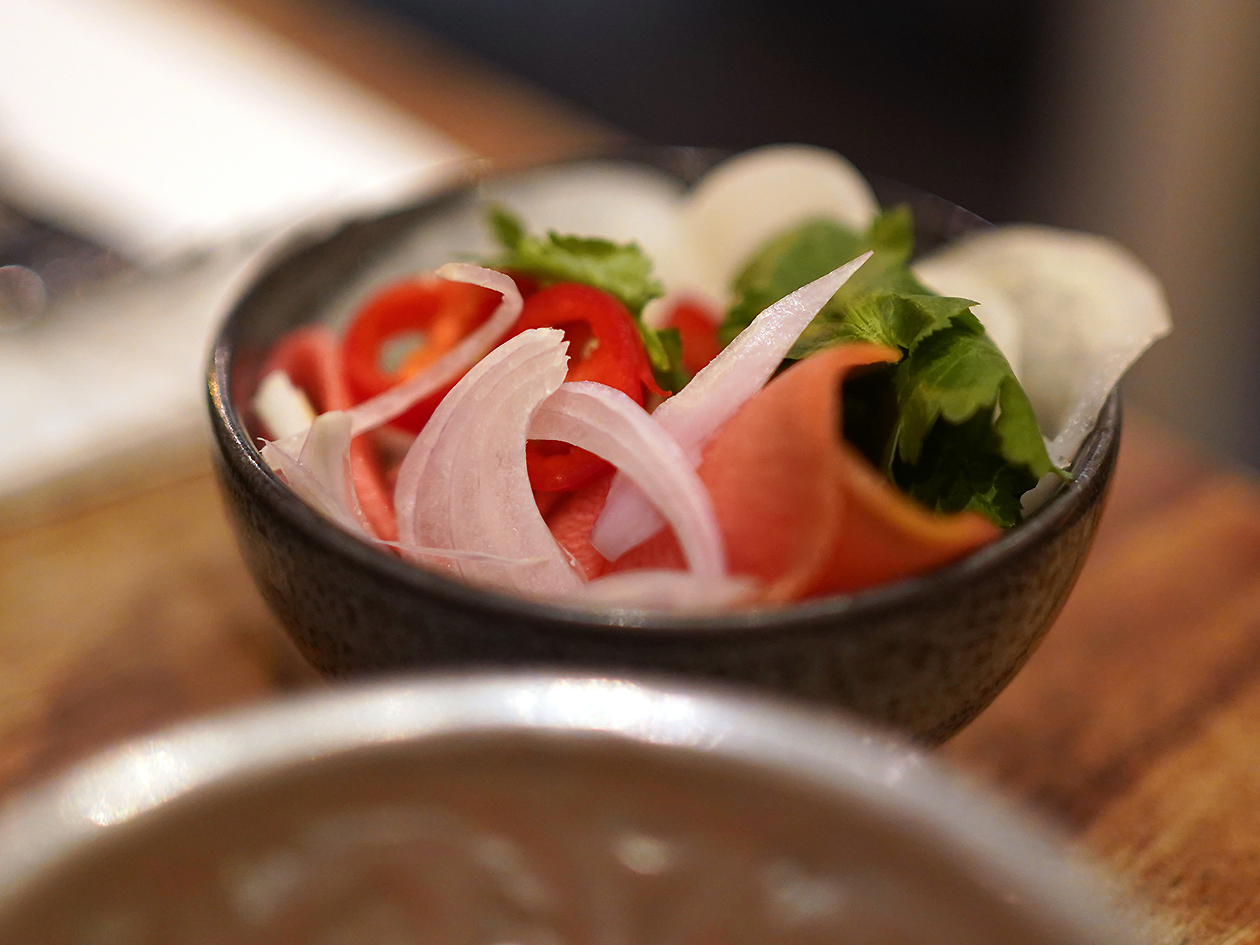 A crunchy and tartly sour selection of pickled vegetables were let down only by the meek chilli brine.