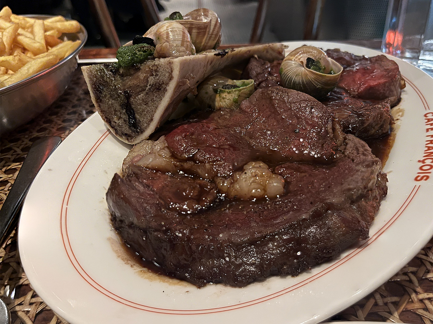 illustrative photo of the prime rib with bone marrow, escargots and frites at Cafe Francois