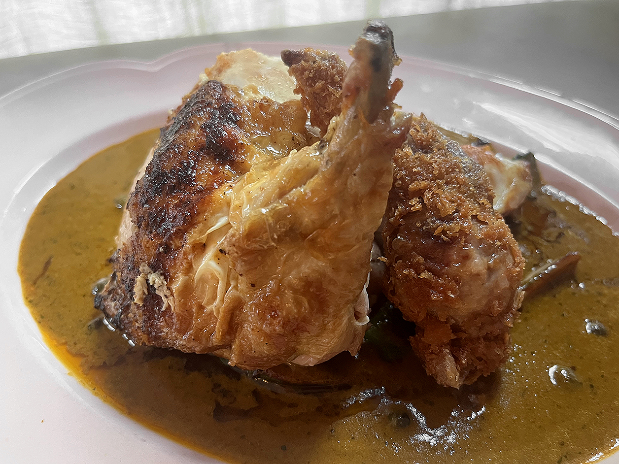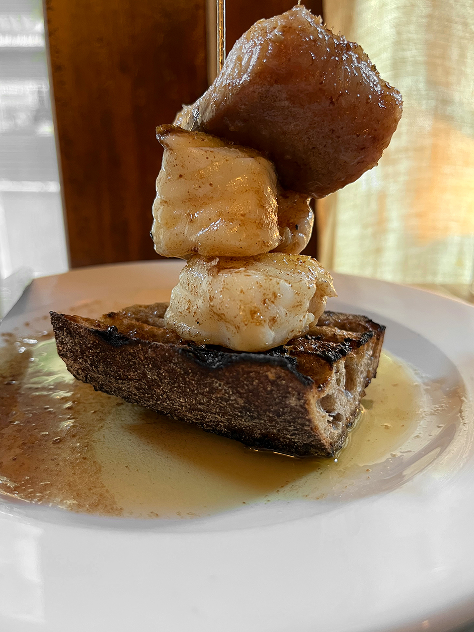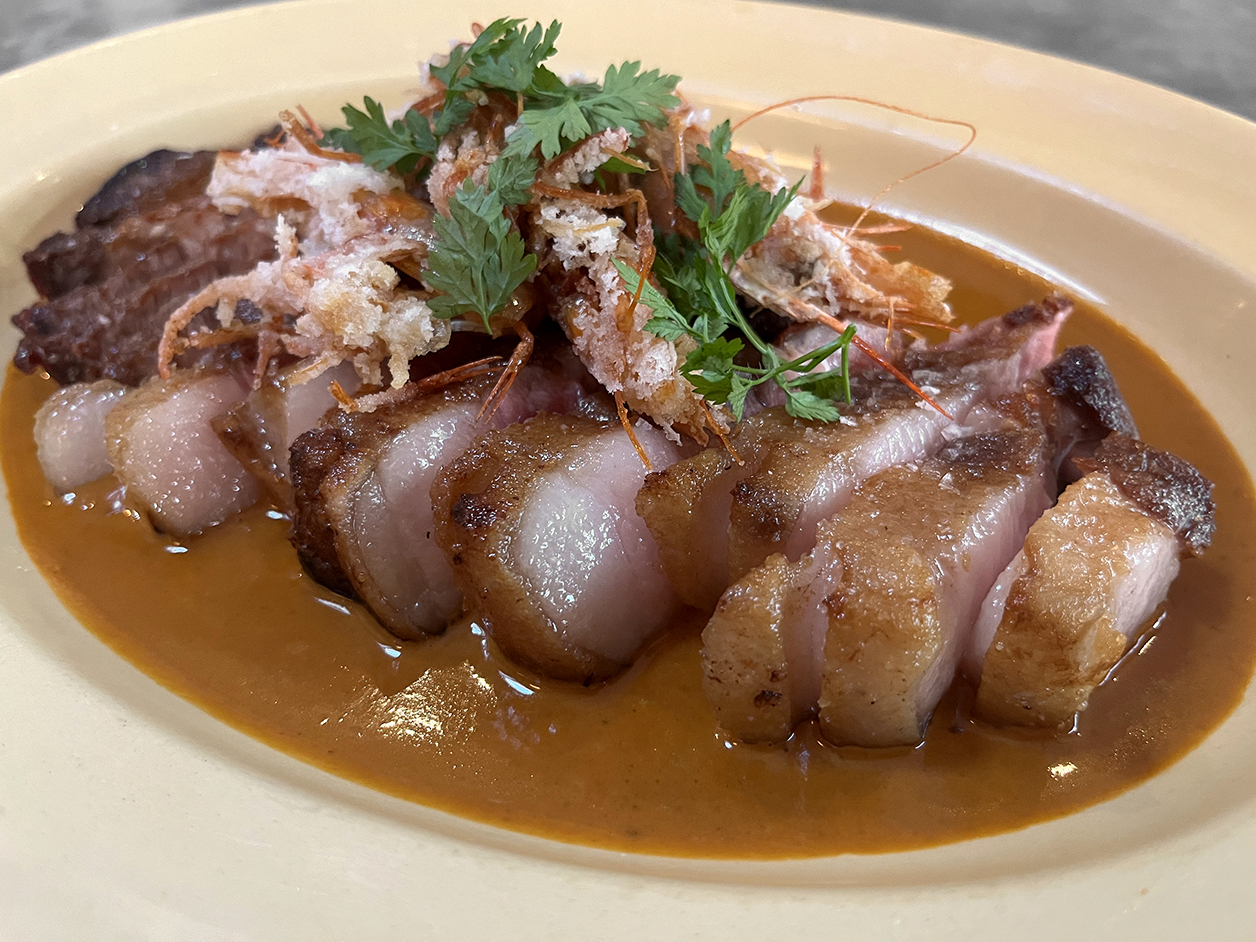 Sliced pork chop benefitted from seams of slightly chewy fat in places, which is just as well as some slices were on the dry side. The fat wasn’t alone in picking up the white meat’s slack. A sauce americaine vavavoomed with prawn heads was eminently scoopable due to its bisque-like aroma, while the extant prawn heads added crackle, crunch and funk to the proceedings.