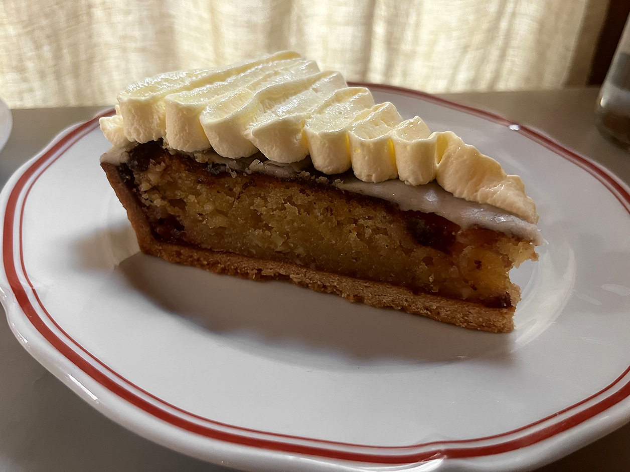 Camille’s raspberry tart had jam tart-vibes, but this was not a tawdry effort from Mr Kipling or Cafe Francois. Tightly crumbed yet pliably breakable pastry came filled with a sugary sweet filling that was reasonably evocative of the fruit.